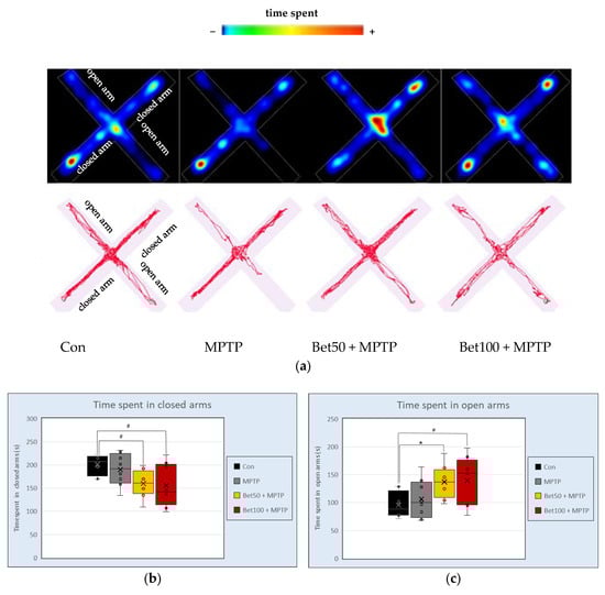 Representative movement trajectories during the Elevated Plus Maze (EPM) test: heatmaps and trace plots (a) showing the activity of control (Con, n = 8), MPTP-treated (MPTP, n = 8), and MPTP plus betanin-treated animals (Bet50 + MPTP, n = 8; Bet100 + MPTP, n = 8). Time (s) spent in the closed (b) and open (c) arms of the apparatus. * vs. Con, p < 0.05 (NK); # vs. Con, p < 0.05 (NIR). Horizontal line—median, x—mean.