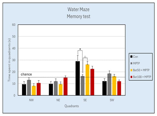 Time (s) spent in each of the four quadrants during the Water Maze Memory test (day 5) of the control group (Con, n = 8), and animals with the neurotoxin MPTP alone, (MPTP, n = 8), and with the combination of betanin (Bet50 + MPTP, n = 8; Bet100 + MPTP, n = 8). * vs. Con, p < 0.05 (NK), □ MPTP vs. Bet50 + MPTP, p < 0.05 (NIR). The horizontal line represents the chance level (25%), which reflects the expected performance if the animal were swimming randomly without spatial memory of the platform location.