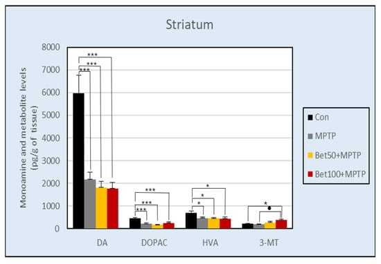 Concentration of DA and its metabolites: DOPAC, HVA and 3-MT in the striatum of mice from the control group, MPTP injected group and animals treated with MPTP in combination with betanin. Data represent means ± SEM of 8 animals in each group. * vs. Con, p < 0.05 (NK); *** vs. Con, p < 0.005 (NK); ● MPTP vs. Bet100 + MPTP, p < 0.05 (NK).