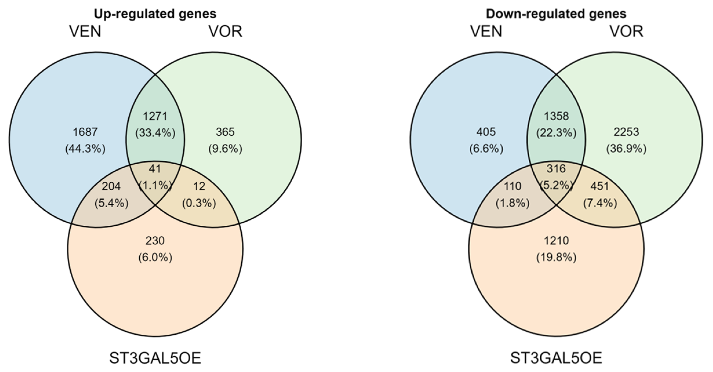 2.2. Transcriptomic Profiling Identifies a Convergent Gene Expression Signature Across VEN, VOR, and ST3GAL5 Overexpression