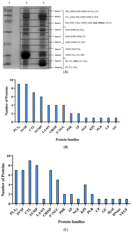 - Yasmin, R.; Thakur, S.; Blotra, A.; Sahu, A.; Vasudevan, K.; Reza, M.A.; Doley, R. Proteome analysis of Daboia russelii venom, a medically important snake from the Indian sub-continent. Toxicon 2024, 237, 107532. [Google Scholar] [CrossRef] [PubMed]