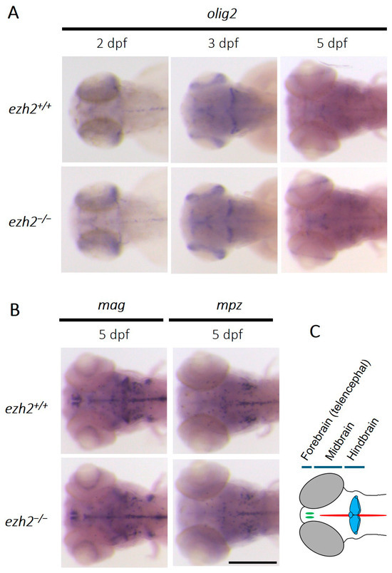 Role of ezh2 in oligodendrocyte development: (A) whole-mount RNA in situ hybridization of the brain region of ezh2+/+ and ezh2−/− siblings at 2, 3 or 5 dpf, as indicated, to detect olig2 expression as a marker of the oligodendrocyte lineage; (B) whole-mount RNA in situ hybridization of the brain region of ezh2+/+ and ezh2−/− siblings at 5 dpf to detect mag or mpz expression, as markers of mature oligodendrocytes. Scale bar is 200 µm; and (C) schematic representation of zebrafish brain organization at 5 dpf. Olfactory bulbs are shown in green, the midline in red, and the cerebellum in blue.