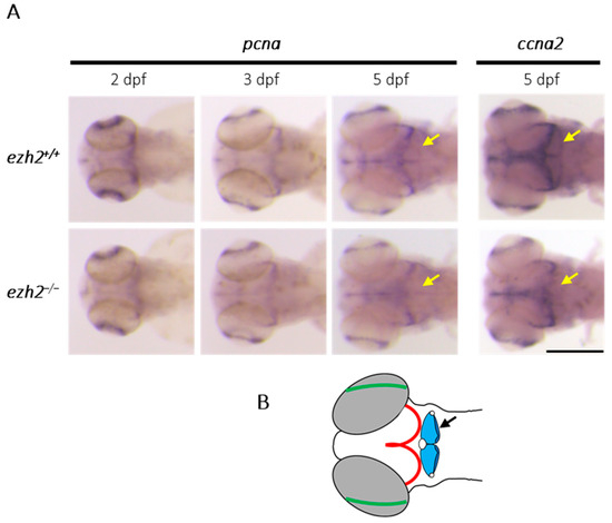 Role of ezh2 in cerebellar progenitor proliferation: (A) whole-mount RNA in situ hybridization of the brain region of ezh2+/+ and ezh2−/− siblings at 2, 3 or 5 dpf, as indicated, to detect the expression of the proliferation markers pcna and ccna2. The yellow arrows emphasize expression profile differences in the cerebellum between ezh2+/+ and ezh2−/− larvae. Scale bar is 200 µm; and (B) schematic representation of zebrafish brain organization at 5 dpf. The retina is shown in green, the tectal proliferation region in red, and the cerebellum in blue with a black arrow.