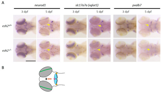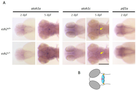 Like the mammalian cerebellum, the zebrafish cerebellum contains a diversity of neuronal subtypes that can be categorized according to the nature of their neurotransmitters; excitatory neurons are mainly glutamatergic and inhibitory neurons are mainly GABAergic. The glutamatergic population includes granule cells, unipolar brush cells, and eurydendroid cells, whereas the GABAergic population comprises Purkinje cells and local interneurons. These neurons originate from two distinct progenitor domains; glutamatergic neurons derive from progenitors expressing proneural atoh1 genes, while GABAergic neurons derive from ptf1a-expressing progenitors [27]. To investigate the effect of ezh2 loss-of-function on cerebellar neurogenesis, we analyzed the expression of key cerebellar progenitor markers in wild-type and ezh2 mutant zebrafish larvae using in situ hybridization (Figure 3A).