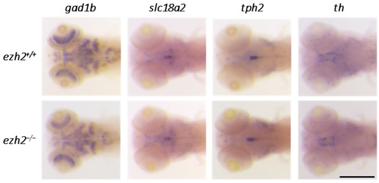Role of ezh2 in the development of neurotransmitter-specific neuronal populations: whole-mount RNA in situ hybridization of the brain region of ezh2+/+ and ezh2−/− siblings at 5 dpf to detect the expression of gad1b, labeling GABAergic neurons, slc18a2, labeling catecholaminergic neurons, tph2, labeling serotonergic neurons, and th, labeling dopaminergic neurons. Scale bar is 200 µm.