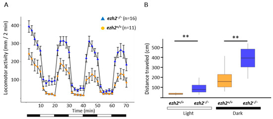 Moreover, the assay reveals a hyperlocomotor phenotype and an increased total swimming distance (Figure 6B) for ezh2−/− mutants at 5 dpf when compared to wild-type larvae. This indicates that ezh2 plays a role in the locomotor activity of zebrafish larvae at 5 dpf.