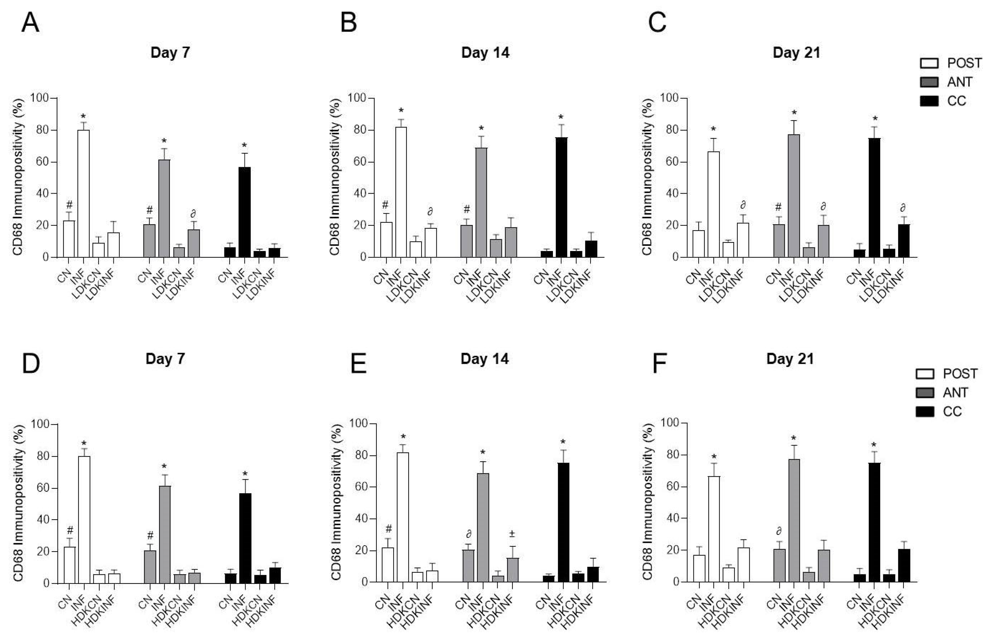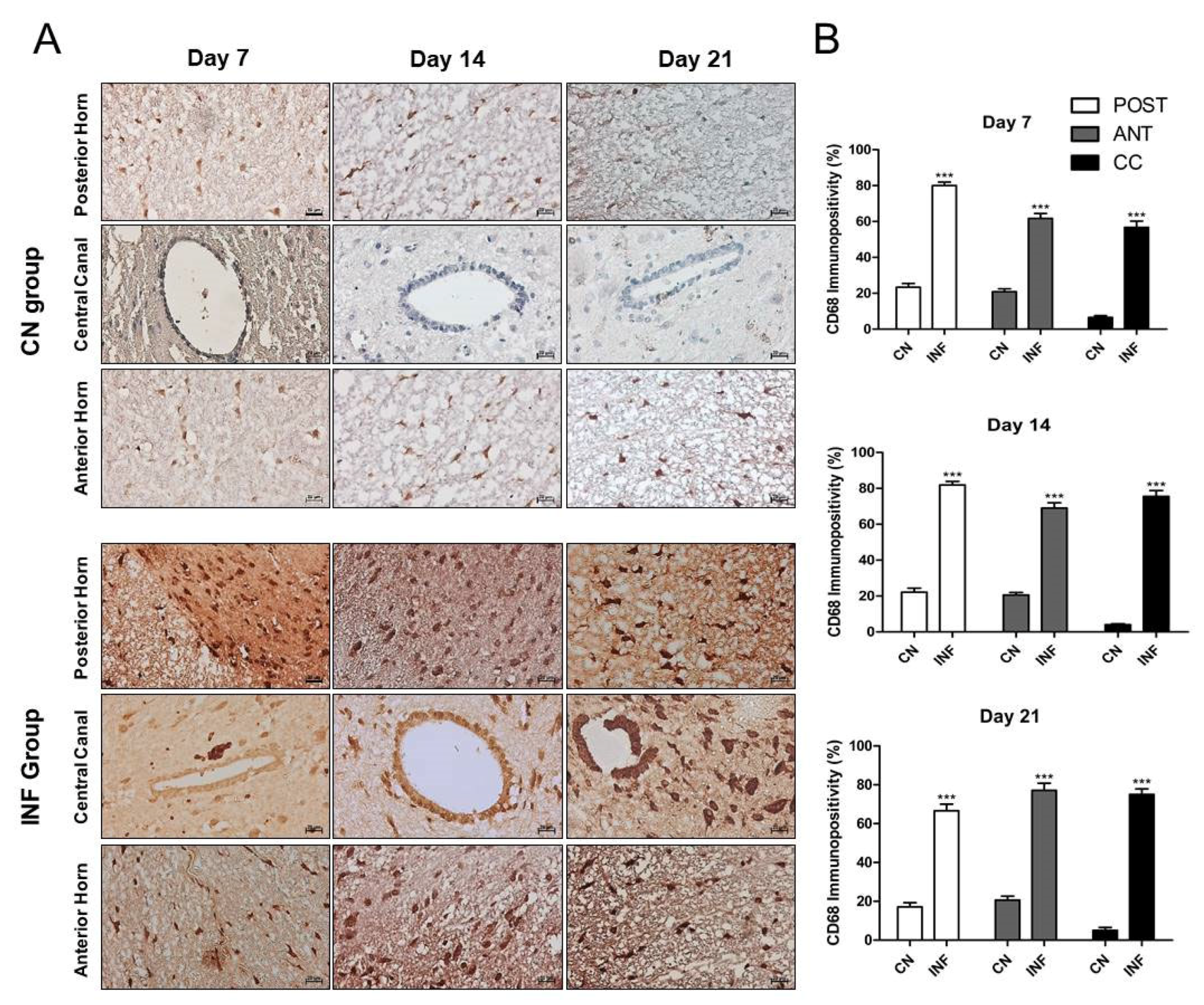 2.8.7. Comparisons of CD68-Immunopositivity in the Different Regions of the Spinal Cord of All Animal Groups