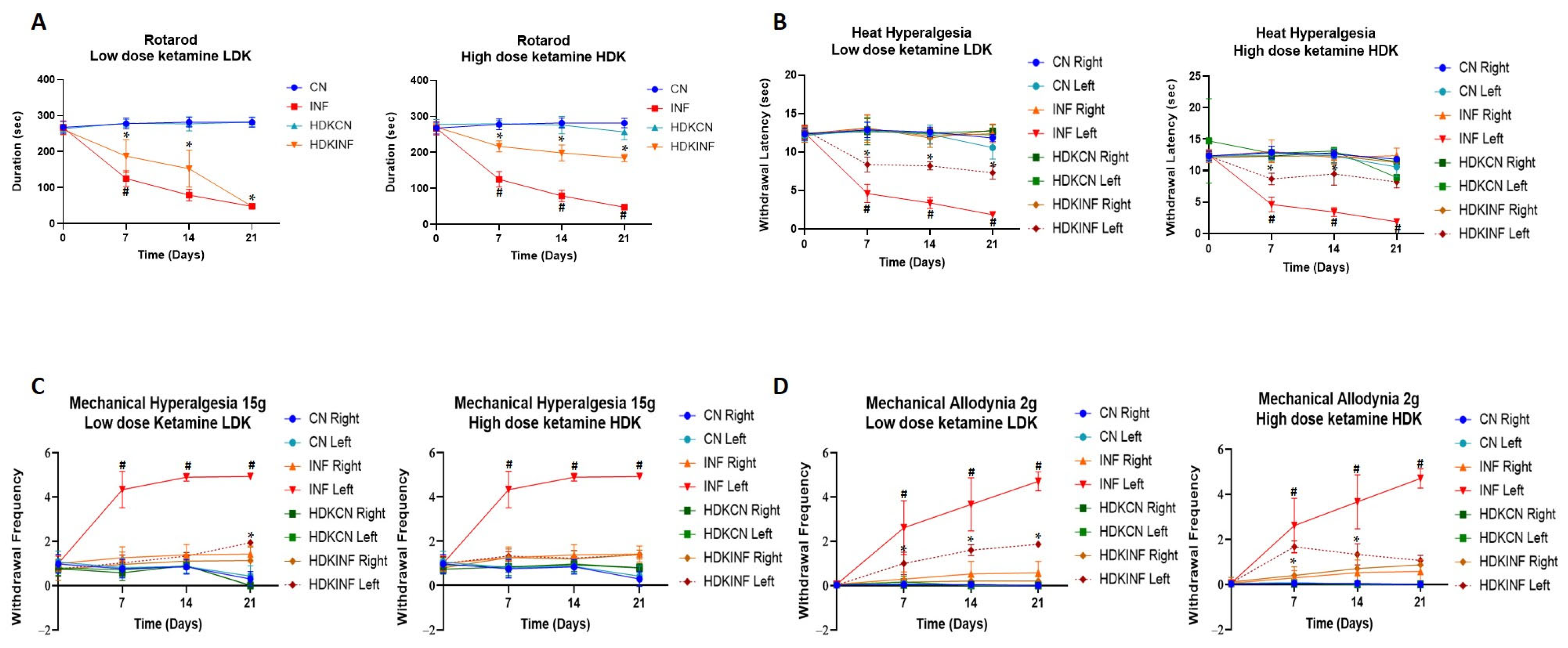 2.8.5. Expression of HSPs in the Spinal Cord of Control and Inflamed Rats Treated with Low and High Doses of Ketamine