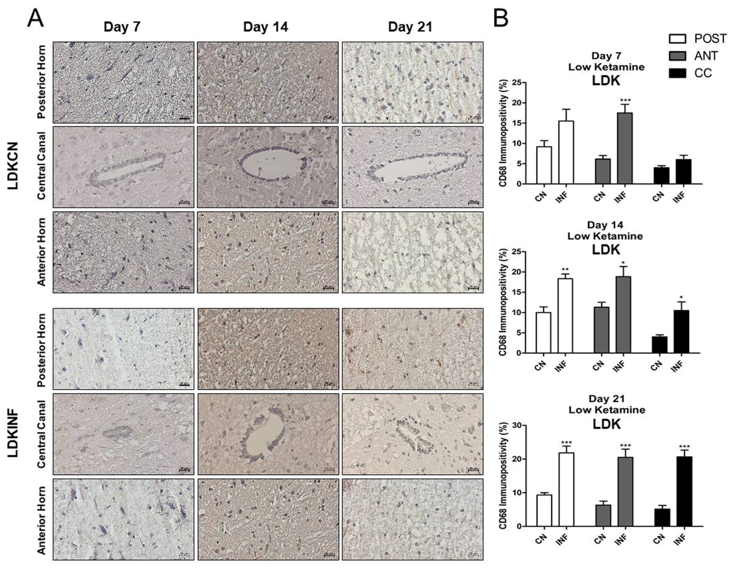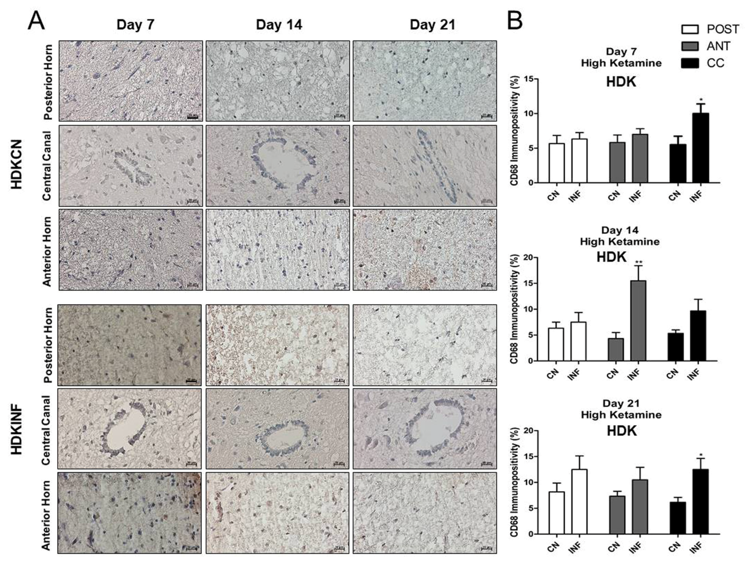 2.8.6. CD68-Immunopositivity in the Different Regions of the Spinal Cord of Rats Treated with Ketamine