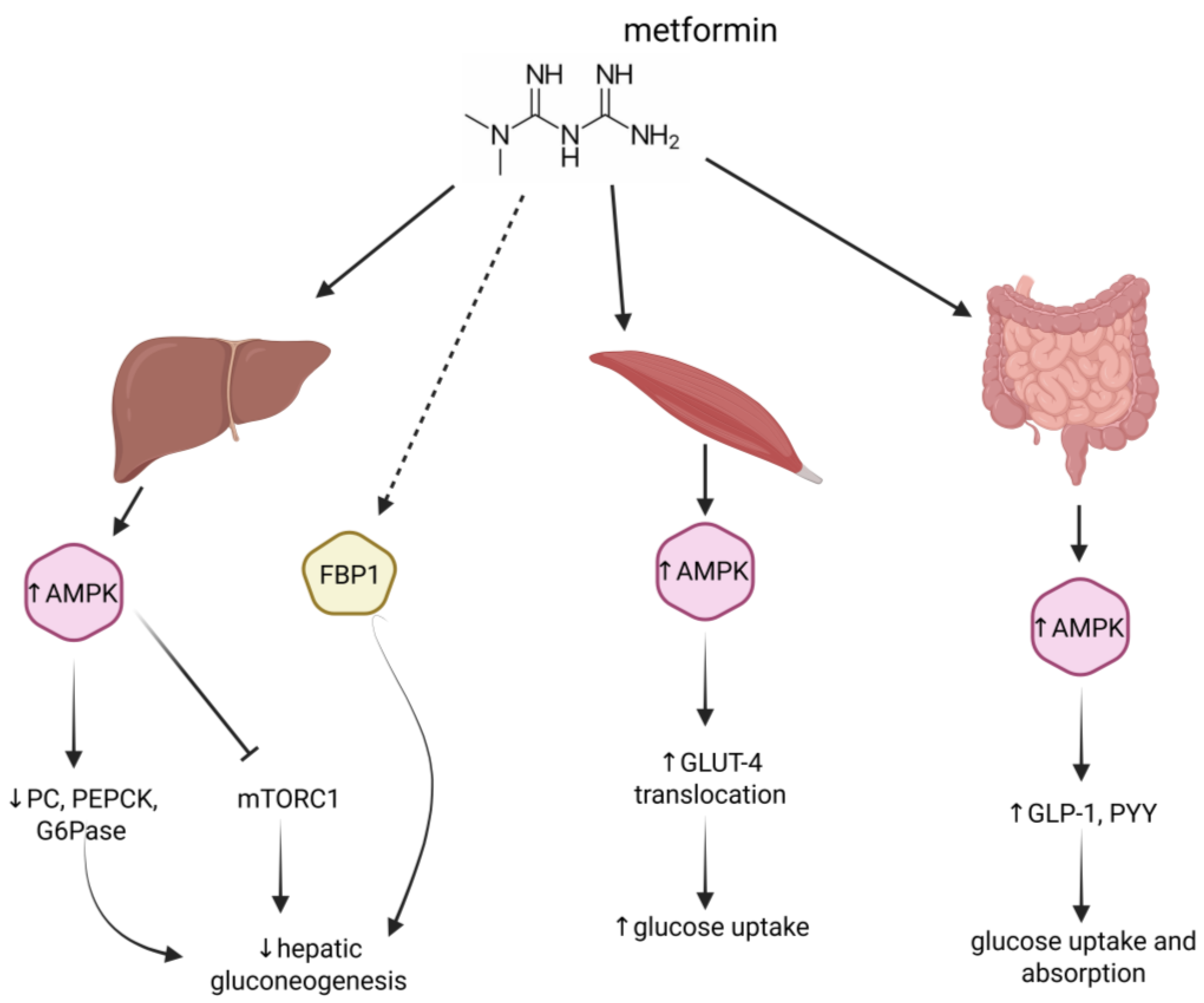 Specifically, metformin suppresses the expression of gluconeogenic genes, such as phosphoenolpyruvate carboxykinase, glucose 6 phosphatase, and pyruvate carboxylase by inhibiting gluconeogenesis through AMPK-dependent activation of small heterodimer partner (a member of the nuclear receptor superfamily) and inhibition of cAMP response element-binding protein (CREB) phosphorylation [47,48]. Furthermore, it may also suppress hepatic gluconeogenesis through AMPK-dependent inhibition of the protein kinase mTORC1 [49]. Metformin can also decrease hepatic glucose production in an AMPK-independent manner. In this regard, a recent study reported that metformin achieves this by directly bind fructose-1,6-bisphosphatase-1 enzyme, leading to a reduction in hepatic glucose production [50]. Additionally, other studies have revealed its effect in attenuating glucagon activity [51], inhibiting mGPDH [44], and lowering plasma glucose levels by enhancing GLUT-1-mediated glucose transport into hepatocytes through insulin receptor substrate 2 (IRS-2) activation [52]. Overall, these effects lead to a reduction in hepatic sugar production, improved glucose utilization in muscles, a decrease in fat synthesis (lipogenesis), and an increase in fat breakdown (lipolysis).