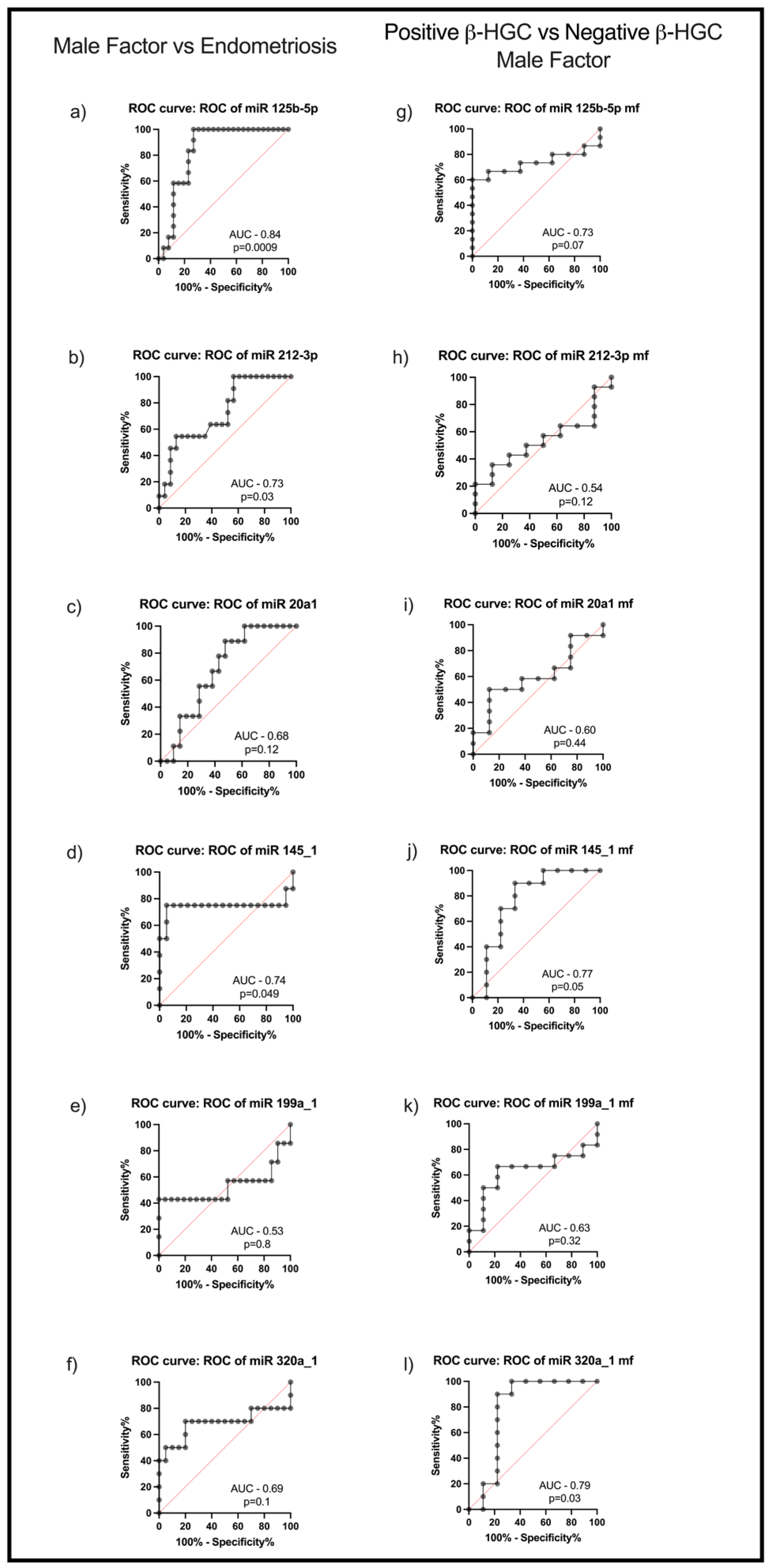 2.4. MiR125b-5p, miR212-3p, and miR145_1 Levels in FF Are Putatively Predictors of Endometriosis and miR145_1 and miR320a_1 of Biochemical Pregnancy