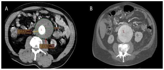 Computed tomography (CT) images illustrating different morphologic features of abdominal aortic aneurysms. (A) In a 69-year-old male patient who developed PIS, subtraction of the aortic lumen area (L; yellow arrow; red “+” symbols indicate the measurement boundaries in the analyzed area) from the total aneurysm area (red arrow) demonstrates a mural thrombus (T) with a maximum thickness of 3.66 cm in the transverse plane, corresponding to a cross-sectional area of at least 44 cm2. Although aneurysms are inherently three-dimensional structures, planar measurements provide clinically relevant information on thrombus burden. (B) In a 72-year-old female patient who developed PIS, an aneurysm measuring nearly 10 cm in maximum diameter was observed. The aortic lumen (L) was entirely encompassed by the aneurysmal sac, appearing uniformly dilated with smooth margins and without mural thrombus formation. At the 6-month follow-up, however, thrombosis of the excluded lumen following EVAR resulted in an apparent increase in aortic wall thickness. These contrasting examples suggest that aneurysm morphology—including thrombus presence, thickness, and sac size—may influence the risk of PIS.