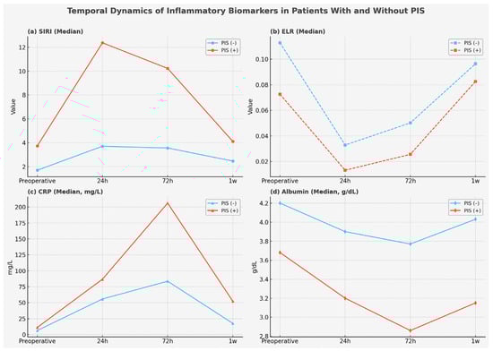 Temporal dynamics of inflammatory biomarkers in patients with and without postimplantation syndrome (PIS). Median values of systemic inflammatory response index (SIRI, panel (a)), eosinophil-to-lymphocyte ratio (ELR, panel (b)), C-reactive protein (CRP, mg/L; panel (c)), and albumin (g/dL; panel (d)) are shown at baseline (preoperative), 24 h, 72 h, and 1 week postoperatively. Patients with PIS exhibited markedly higher SIRI and CRP values, persistently lower ELR, and reduced albumin concentrations compared with those without PIS, particularly in the early postoperative period.