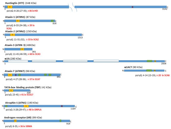 - La Spada, A.R.; Taylor, J.P. Polyglutamines placed into context. Neuron 2003, 38, 681–684. [Google Scholar] [CrossRef] [PubMed]