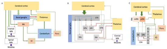 - Bostan, A.C.; Strick, P.L. The basal ganglia and the cerebellum: Nodes in an integrated network. Nat. Rev. Neurosci. 2018, 19, 338–350. [Google Scholar] [CrossRef]
