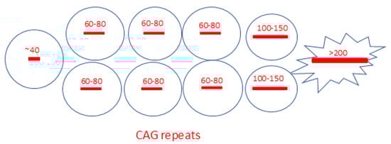 - Telenius, H.; Kremer, B.; Goldberg, Y.P.; Theilmann, J.; Andrew, S.E.; Zeisler, J.; Adam, S.; Greenberg, C.; Ives, E.J.; Clarke, L.A.; et al. Somatic and gonadal mosaicism of the Huntington disease gene CAG repeat in brain and sperm. Nat. Genet. 1994, 6, 409–414, Erratum in Nat. Genet. 1994, 7, 113. [Google Scholar] [CrossRef]
