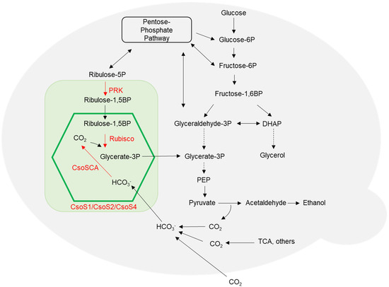 Many metabolic engineering strategies to develop CO2-fixing S. cerevisiae strains have been reported [14]. One approach is to heterologously express the Calvin–Benson–Bassham (CBB) cycle-related enzymes in yeast. The expression of Calvin cycle enzymes, specifically phosphoribulokinase (PRK) and Rubisco, in S. cerevisiae allows for the reaction of CO2, which is a significant byproduct of alcoholic fermentation, with Ribulose 1,5-bisphosphate (RuBP) to produce 3-phosphoglycerate. This compound could be converted to phosphoenolpyruvate (PEP) and ultimately lead to ethanol production. Heterologous expression of form-II Rubisco (L8) and PRK in S. cerevisiae improved ethanol production [15]. A xylose-fermenting S. cerevisiae was engineered to achieve biofuel production by expressing form-II Rubisco (L8 or L2) or form-I Rubisco (L8S8)-PRK module [16,17]. However, there are no studies reporting on the generation of α-carboxysome structures to provide the low oxygen environment for CO2 fixation in S. cerevisiae.