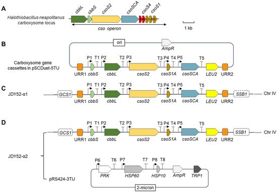 pSCDuet was modified by ligating fragments URR1-LEU2-URR2 to create pSCDuet-URR. The pSCDuet-URR was linearized to ligate with carboxysome cassette, resulting in pSCDuet-5TU. Then the fragment of URR1-carboxysome cassette-LEU2-URR2 was cleaved from this vector and transformed into yeast strain JDY52-URR. The URR1-carboxysome cassette-LEU2-URR2 was integrated into the yeast genome at the URR sites, leading to the generation of yeast strain JDY52-α1. Positive colonies were selected on SD medium lacking Leu.
