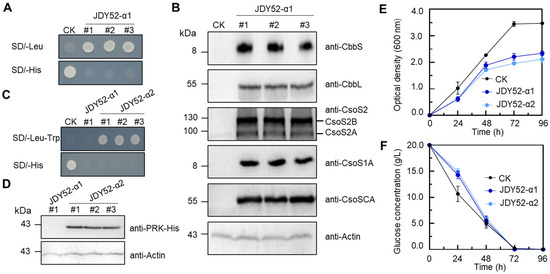 Characterization of engineered S. cerevisiae strains JDY52-α1 and JDY52-α2. (A,C) Growth phenotype of JDY52-α1 and JDY52-α2 on indicated media plates. CK, JDY52-URR as the control. (B) Immunoblot analysis of carboxysome genes of three JDY52-α1 strains that were randomly chosen and cultured on SD lacking Leu. The antisera for each protein (CbbS, CbbL, CsoS2, CsoS1A, and CsoSCA) were used to detect the protein abundance. The antisera against CsoS2 were able to detect both CsoS2A (truncated CsoS2) and CsoS2B (full-length CsoS2). Actin was used for equal loading control. (D) Immunoblot analysis of PRK protein of yeast strain JDY52-α2. His-tagged PRK protein was detected by anti-His antibody. Actin was used for equal loading control. (E) Time–course growth curve of different S. cerevisiae strains grown on SC media. Optical density at 600 nm was measured. (F) Time–course glucose consumption of S. cerevisiae strains grown on SC media. In (E,F), data represented three biological replicates and error bars indicated standard deviations.