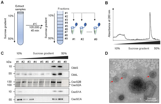 To further characterize the α-carboxysome-like structures, carboxysomes were isolated from S. cerevisiae strain JDY52-α2 by sucrose density gradient centrifugation following modified procedures from [30,31], as briefly illustrated in Figure 5A. H. neapolitanus α-carboxysomes were found to be enriched in fractions 7 and 8 after ultracentrifugation. These two fractions demonstrated higher absorbance at 280 nm (Figure 5B). The carboxysome shell protein (CsoS1A), scaffolding proteins (CsoS2A and CsoS2B) and proteins inside shells (CbbL, CbbS, CsoSCA) were all detectable in fractions 7 and 8 by immunoblotting with corresponding antibodies (Figure 5C), suggesting that carboxysome shells were assembled and that proteins CbbL, CbbS, and CsoSCA were successfully recruited into the shells in S. cerevisiae. Fractions 7 and 8 were further analyzed by negative-staining electron microscopy (EM). The reconstructed polyhedral shells with a diameter of 100–200 nm were observed (Figure 5D). Those results showed that carboxysome proteins (CsoS2A, CsoS2B, and CsoS1A) are sufficient for shell assembly in S. cerevisiae.