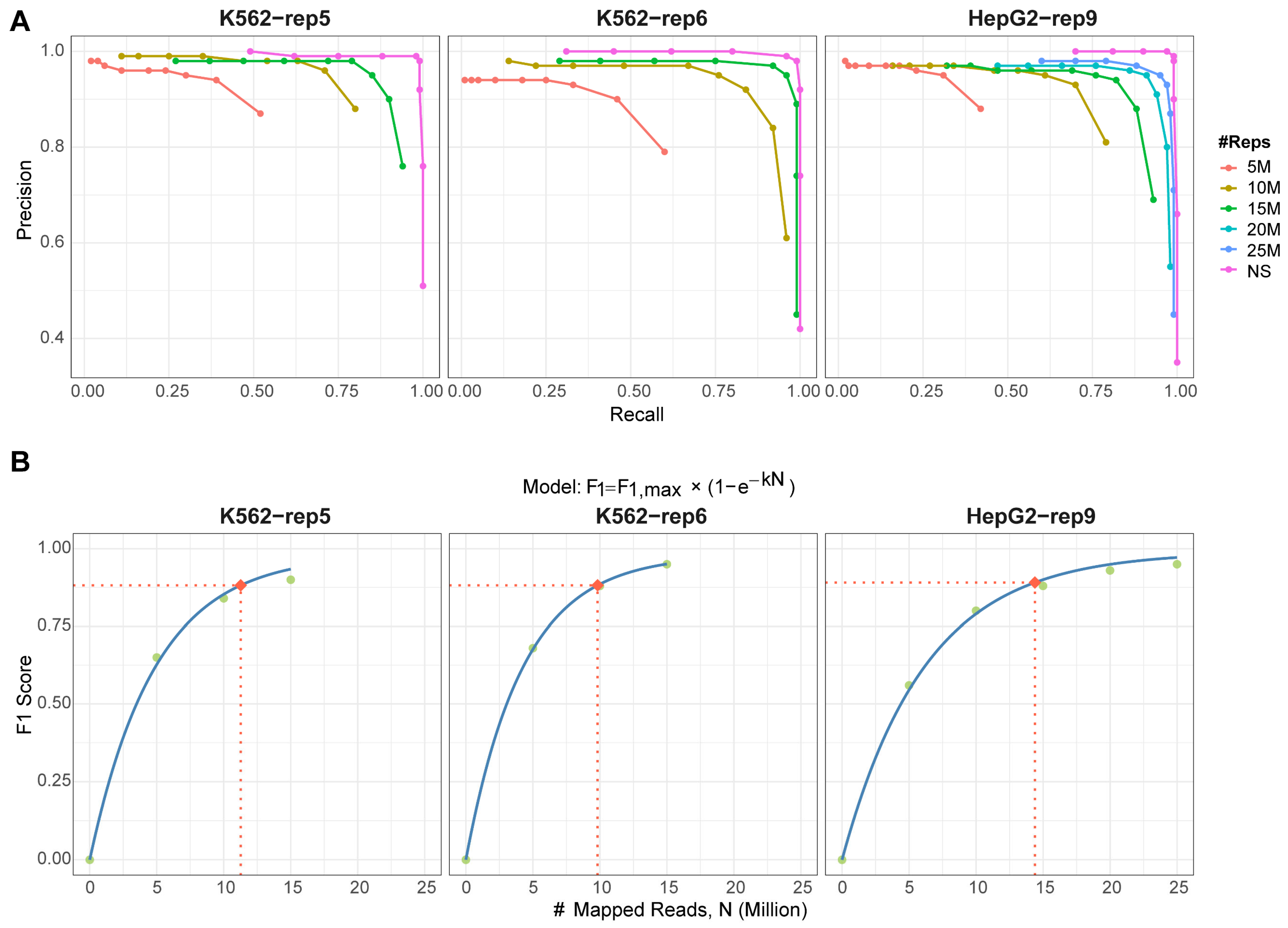 Figure 4B). Using 90% of the maximum F1 score as a performance threshold, we found that approximately 10–15 million mapped reads are necessary to achieve this benchmark. This recommendation aligns with the ENCODE guidelines [