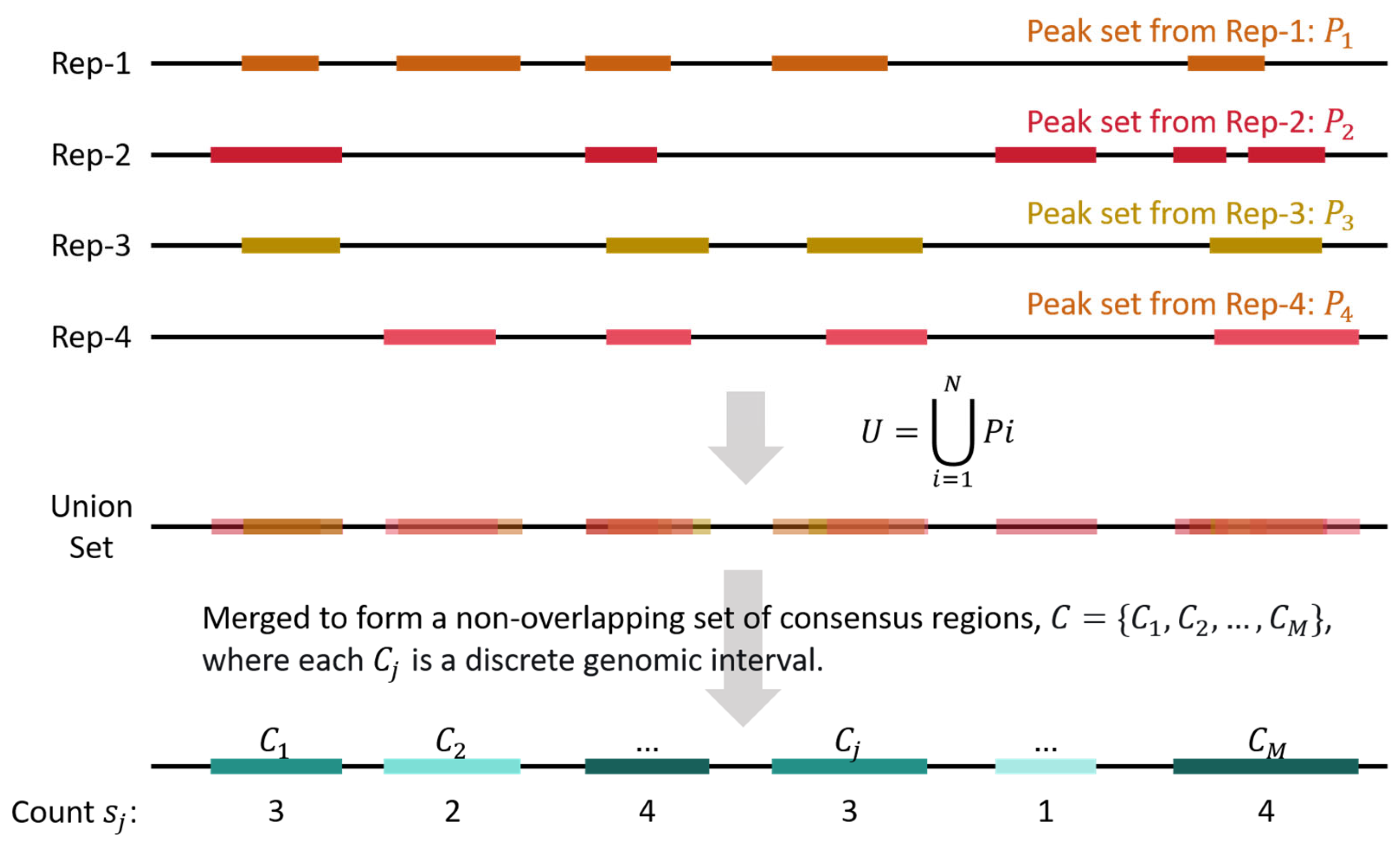 be the set of genomic intervals (peaks) called from replicate Rep-