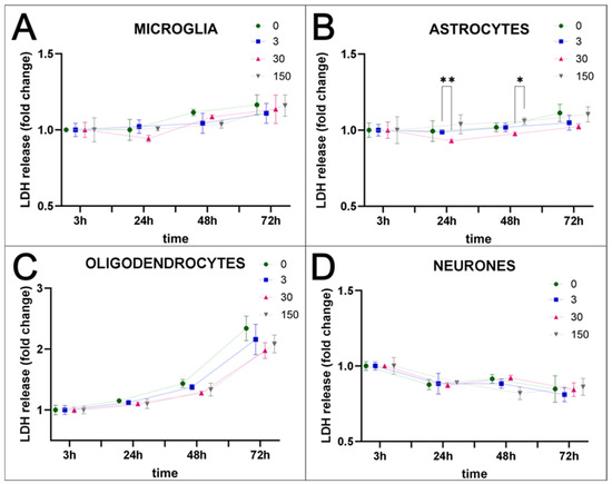 Nanoparticles could serve as a very useful tool to stain the selected cells within body tissues, especially those fluorescently labelled, which facilitate the identification of cells within examined tissues. To check the utility of SPAchips® in studying cells of the nervous tissue, naïve, non-passaged and non-stimulated primary neural cells were incubated in vitro with two different concentrations of these chips (Figure S1A). To recreate in vitro physiologically normoxic conditions of the brain nervous tissue, cells were cultured in strictly controlled environmental conditions, corresponding to 5% O2 and 5% CO2. To avoid stimulation or potential protection by undefined factors, cells were kept in a serum-free media during the entire period of cell co-culturing with the tested nanoparticles. The very first observations on the interaction of the chips with cells were performed on cultures labelled with Hoechst and observed in fluorescence and transmitted light (Figure S1B–E). Numerous red-labelled SPAchips® of characteristic shape were found in the ramified, non-stimulated microglial cells (Figure S1B,C). Contrary to the chips found in microglial cells, single chips were observed very close to astrocyte cells (Figure S1D), and some were also attached to cultured neurons (Figure S1E); however, their exact localization on the cell membrane should be further confirmed with selective membrane tracers. Cultured cells did not change their morphology during incubation with SPAchips®, nor did they induce condensation of chromatin and nuclear shrinkage. This suggests that SPAchips® are not cytotoxic to the neural cells. This observation was further confirmed by biochemical assay based on the measurement of the activity of the lactate dehydrogenase (LDH), which is released from the cytosol of damaged cells into the culture medium. The tested concentrations of nanoparticles corresponded to either 3, 30, or even as much as 150 × 103 SPAchips® per well. LDH activity was measured in supernatants of all of the examined cultures of neural cell fractions at 3, 24, 48, and 72 h of incubation (Figure 1A–D). According to two-way ANOVA of the obtained data, the only factor significantly affecting the results was the time of incubation. Statistically significant differences were observed for multiple comparisons for different SPAchips® concentrations in astrocytic fraction only at 24 h (** p < 0.01) and at 48 h (* p < 0.05; Figure 1B). However, at the later time point, i.e., at 72 h of incubation, the potential differences were not statistically significant; thus, they do not represent a significant trend.