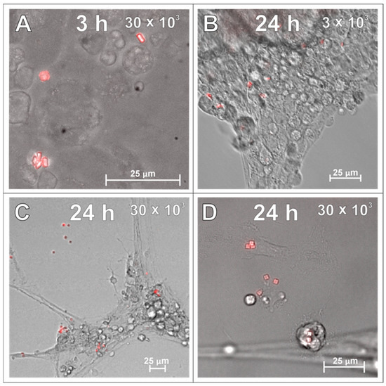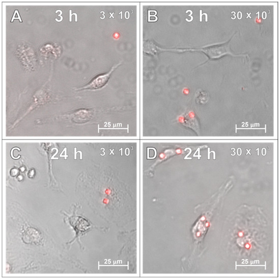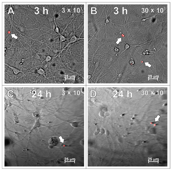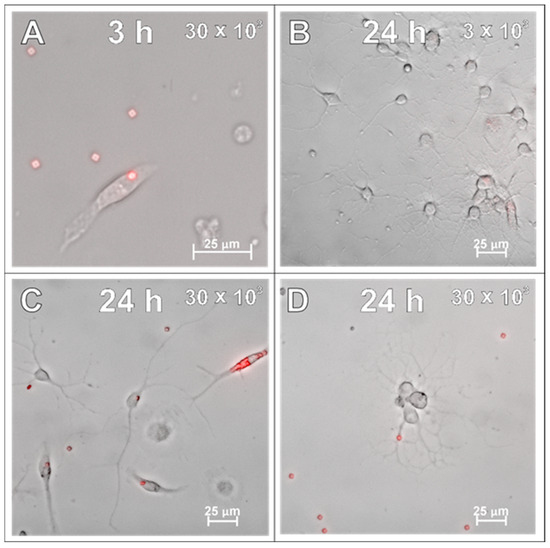After examining the glial cells of the developing brain, which are all supportive of neurons and guarantee the proper, physiological functioning of the nervous tissue, the primary cultures of neurons were studied in the context to be labelled with the applied SPAchips®. Similarly to what was verified on glial cells, live observations were also performed on neurons cultured with SPAchips® administered in two doses. Thanks to the live recording of the cells with the use of the confocal CellObserver system at 3 (Figure 8A,B) and 24 h (Figure 8C,D), after applying SPAchips® in the two tested doses, their localization on the surface of the neuronal cultures was noted. This system also allowed us to visualize cultured cells within the first hours after supplementing culture media with the tested factors and to confirm that the experimental variant is morphologically comparable to the untreated controls.
