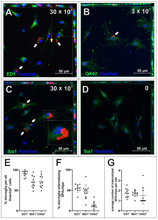 Microglia cell cultures incubated with either 30 × 103 (A,C) or 3 × 103 (B) microchips per 4 × 104 cells, control cultures without chips (D), fixed after 48 h of incubation. Cultures were labelled with Hoechst to visualize cell nuclei as well as with antibodies for typical markers of microglia/macrophages: ED1 (A), OX42 (B) and Iba1 (C,D). White arrows indicate chips inside cells. Yellow arrows indicate chip outside cell. Z-stack images were collected with Zeiss LSM780 confocal microscope under magnification 40×. Scale length in image corresponds to 50 µm. (E–G) Counting of ED1+, Iba1+, and OX42+ cells in isolated microglial cultures. (E) Positively labelled cells constituted percentage of all Hoechst+ cells in the culture. (F) Percentage of microglia cells identified by selected markers that internalized at least 1 SPAchip. Concentration of SPAchips added to microglia cultures was 30 × 103 SPAchips per 4 × 104 cells for ED1 and Iba1 labelling or 3 × 103 SPAchips per 4 × 104 cells for OX42 labelling. (G) Average number of SPA chips internalized by microglial cells identified by selected markers. (E–G) Cell counting was performed on randomly selected 10 fields of view (black dots).