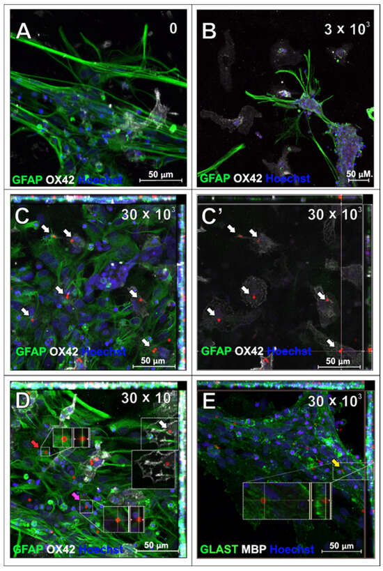Astrocytes which have been incubated with SPAchips® for 48 h to examine their internalization within cell body: untreated control culture (A), cultures supplemented with either 3 × 103 (B) or 30 × 103 (C–E) SPAchips® particles. (C,C’) Single plane focused at level of OX42-positive microglia. Cells were labelled with astrocytic markers (GFAP-green; (A–D); or GLAST-green; (E)) and additionally with either microglial (OX42, white; (A–D)) or oligodendroglial (MBP, white, not found in cultures; (E)) cell markers. Hoechst was used to visualize cell nuclei. White arrows indicate SPAchips® inside cells identified as microglia with OX42 labelling. Yellow arrow: Microchips visible under cell extensions. Red arrow: SPAchips® found close to astrocytes, presumably were attached to cell surface. Pink arrow: Microchips localized between astrocytic cells. Images were collected with application of Zeiss LSM780 confocal microscope under magnification 40×. Scale length in image corresponds to 50 µm.
