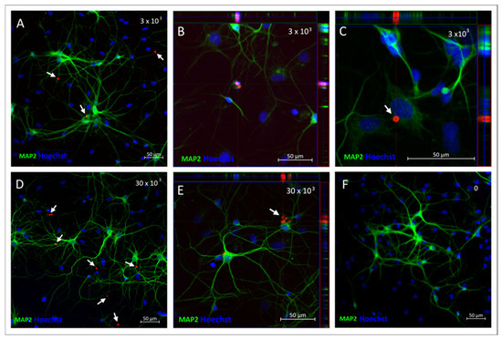 The above observations, as well as the neuronal phenotype of the cultured cells, were confirmed by their immunostaining with the antibody recognizing Microtubule-Associated Protein 2 (MAP2) 48 h after incubation with either 3 × 103 (Figure 9A–C) or 30 × 103 (Figure 9D,E) of SPAchips® and compared to the control neuronal culture (Figure 9F). The Z-stack recording allowed us to check the SPAchips® location in the very close vicinity to the cells; however, examination of several microscopic slides indicate that they are located extracellularly.
