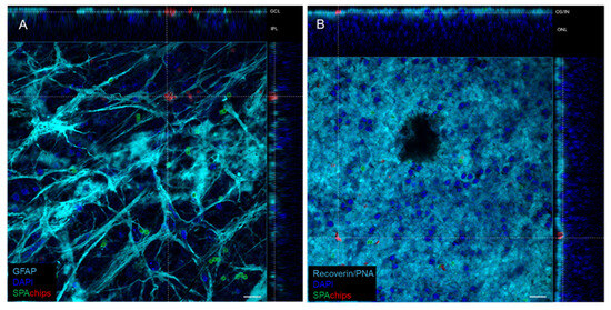 To check the SPAchips® distribution and cellular uptake within a differentiated nervous tissue, we used retinal explants as a model. Retinas were whole-mounted photoreceptor-side up or down and SPAchips® were added and incubated 72 h before fixation. Surprisingly, immunofluorescence images showed that microparticles were mainly internalized by astrocytes in the Retinal Ganglion Cell layer (RGC) (Figure 10A). On the other hand, SPAchips® were easily found in the outer/inner segment (OS/IS) layer, but they could not pass through the Outer Limiting Membrane of the photoreceptors.