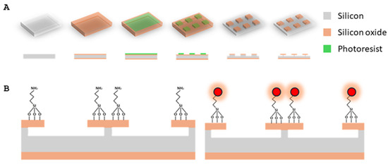 (A) Detailed scheme of fabrication of bare SPAchips: 1-μm silicon oxide layer is grown onto silicon wafer. Then, 3 × 3 μm lateral dimensions are defined by photolithography. Exposed silicon oxide is etched by dry-etching and, finally, after phororesist stripping, RIE step defines anchor beneath each chip. (B) SPAchips functionalization by silanization with APTES and fluorophore immobilization through amino-succinimidyl reaction. Modified from Torras et al. (2016). [11].