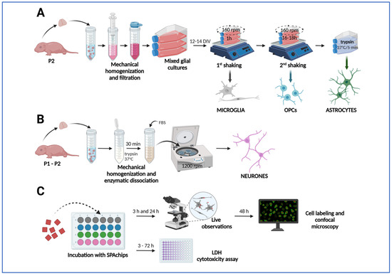 Application of SPAchips® to primary cultures or rat glial and neuronal cells. (A) Establishing primary mixed glial cultures from brain hemispheres of neonatal rats and isolation of glial cell types by shaking-off method to obtain microglia and OPCs and mild trypsinization to obtain astrocytes. (B) Isolation of primary cortical neurons. (C) Culturing cells with addition of SPAchip® and performing analyses to evaluate their effect. The arrows in the diagram show the successive stages of the experiments. Created in BioRender (latest version of web application). https://BioRender.com/huimaqj (accessed on 5 October 2025).