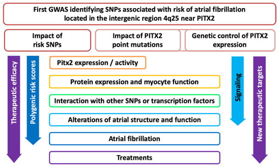 Since single-nucleotide polymorphisms (SNPs) associated with increased risk of atrial fibrillation (AF) on chromosome 4q25 are located near the transcription factor PITX2, research has investigated relationships between SNPs, PITX2 activity and atrial function to improve risk stratification and identify new therapies. Although PITX2 levels are heterogeneous, most studies converge towards lower PITX2 levels in patients with AF, and a 4q25 SNP has been reported to reduce PITX2 expression. However, there are several SNPs at 4q25 that segregate independently, and patients carrying different SNPs respond differently to ablation therapy. On the other hand, atrial-specific deletion of Pitx2c mimics molecular and electrophysiological alterations observed in patients with AF. This includes microRNAs, signaling pathways, ion channels, calcium homeostasis, electrical remodeling, contraction and the response to pharmacological treatments. Moreover, mutations in the PITX2 homeodomain are associated with AF, PITX2 dysfunction or impaired calcium homeostasis. Interestingly, myocytes with the 4q25 risk allele rs13143308T display electrophysiological alterations similar to those reported in patients with AF or mice with heterozygous Pitx2c deletion. Moreover, carriers of rs13143308T respond poorly to ablation or antiarrhythmic drug therapy. Future research needs to establish how different 4q25 SNPs impact different PITX2 isoforms and the downstream regulation of atrial function.