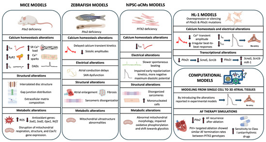 Studies to date have examined PITX2 function across multiple systems, from animal models such as mice and zebrafish to hiPSC-aCMs, HL-1 cells, and computational platforms. Nevertheless, interspecies variation in electrophysiological properties presents a significant challenge for translational research. Parameters such as APD, ion channel expression, and cardiac structure differ markedly across species (e.g., rodents, rabbits, zebrafish and large mammals), influencing both susceptibility to AF and the response to therapeutic interventions. Crucially, many animal models primarily exhibit acute or inducible arrhythmias rather than the sustained, remodeling-driven forms observed in humans. Consequently, modeling the gradual electrophysiological and structural remodeling characteristic of human chronic AF remains a critical obstacle when using animal models, limiting the ability to fully recapitulate human disease pathophysiology and to evaluate long-term therapeutic strategies. Figure 2 summarizes different models used to date to investigate PITX2 role, along with the principal findings associated with each.