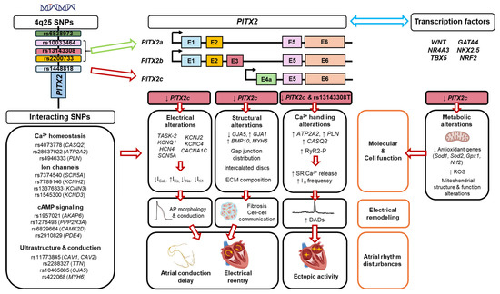 Schematic representation of the complex regulation of cell function by 4q25 SNPs and PITX2 that leads to electrical remodeling and atrial rhythm disturbances. The figure illustrates how PITX2c deficiency, reported to occur for some 4q25 variants (red arrow), causes multiple alterations in molecular and cellular function that lead to both structural and electrical remodeling, known to produce atrial rhythm disturbances observed in AF. However, alterations may be potentiated by synergic interactions with other risk SNPs or transcription factors, leading to an increased net impact of the 4q25 SNPs, or be counteracted by antagonistic interactions with other SNPs or transcription factors, resulting in a reduced net impact of the 4q25 SNPs. Similarly, upregulation of PITX2a by other 4q25 SNPs could modify the combined impact of multiple SNPs, but this remains to be tested. E1-E6: exon 1—exon 6; ICaL,L-type calcium current; IKs, slow rectifier potassium current; INa, sodium current; IK1, inward rectifier potassium current; ECM, extracellular matrix; ITI, transient inward current; DADs: delayed afterdepolarizations; ROS, reactive oxygen species; AP, action potential.