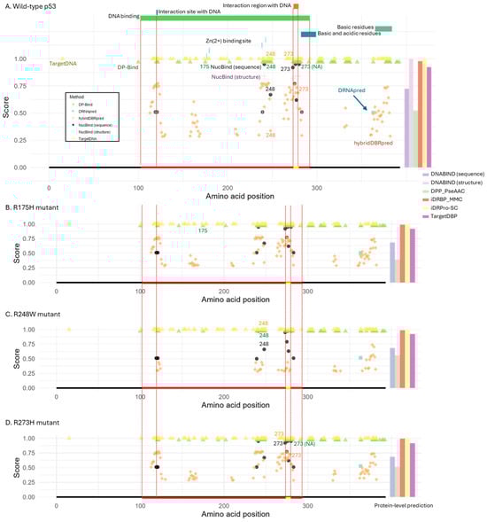 Similarly, we evaluated the performance of the prediction tools on p53, a tumor suppressor protein with a well-defined DNA-binding domain (Figure 3A). We focused on three well-characterized, cancer-associated mutations frequently observed in patients, R175H, R248W, and R273H []. These mutations occur within the DNA-binding domain and are known to impair p53′s DNA-binding ability. Arg-248 and Arg-273 are DNA-contact residues. In R248W mutation, the introduced large hydrophobic side chain prevent sequence-specific DNA binding [], while the shorter lateral chains of histidine in R273H compromises the direct contacts to DNA backbone phosphates []. On the other hand, a bulky histidine in R175H causes structural distortions, destabilizing the core domain, which lead to the loss of DNA-binding ability [].
