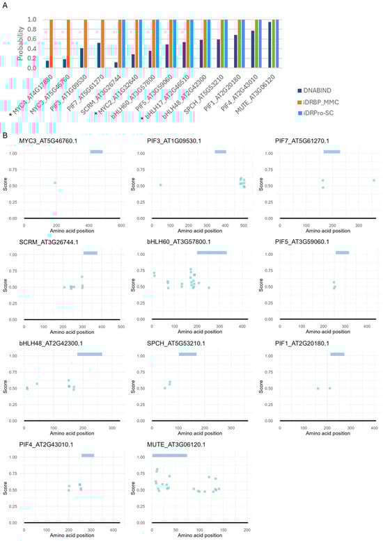 DNA-binding predictions for bHLH proteins with confirmed DNA-binding activity in Arabidopsis thaliana. (A) Protein-level predictions. DNABIND and iDRBP-MMC provide estimated probabilities of DNA-binding, while iDRPro-SC outputs binary classifications (1 = DNA-binding, 0 = non-DNA-binding). (B) Residue-level predictions by DRNApred. Colored bars at the top of each panel indicate the predicted bHLH domain. No DNA-binding residues were predicted for some proteins, which were indicated with * in panel (A).