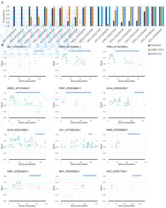 DNA-binding predictions for bHLH proteins lacking DNA-binding activity in Arabidopsis thaliana. (A) Protein-level predictions. DNABIND and iDRBP-MMC provide estimated probabilities of DNA-binding, while iDRPro-SC outputs binary classifications (1 = DNA-binding, 0 = non-DNA-binding). (B) Residue-level predictions by DRNApred. Colored bars at the top of each panel indicate the predicted bHLH domain. The rest of the results are shown in Supplementary Material Figure S1.