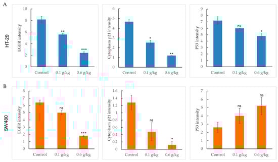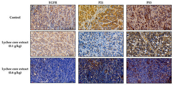 2.5. LCSE Reduces EGFR, p21, and p53 Expression in HT-29 and SW480 Xenograft Tumors