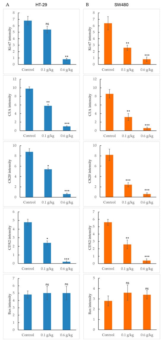 2.6. Dose-Dependent Suppression of Proliferation and Differentiation Markers by LCSE in HT-29 and SW480 Xenografts