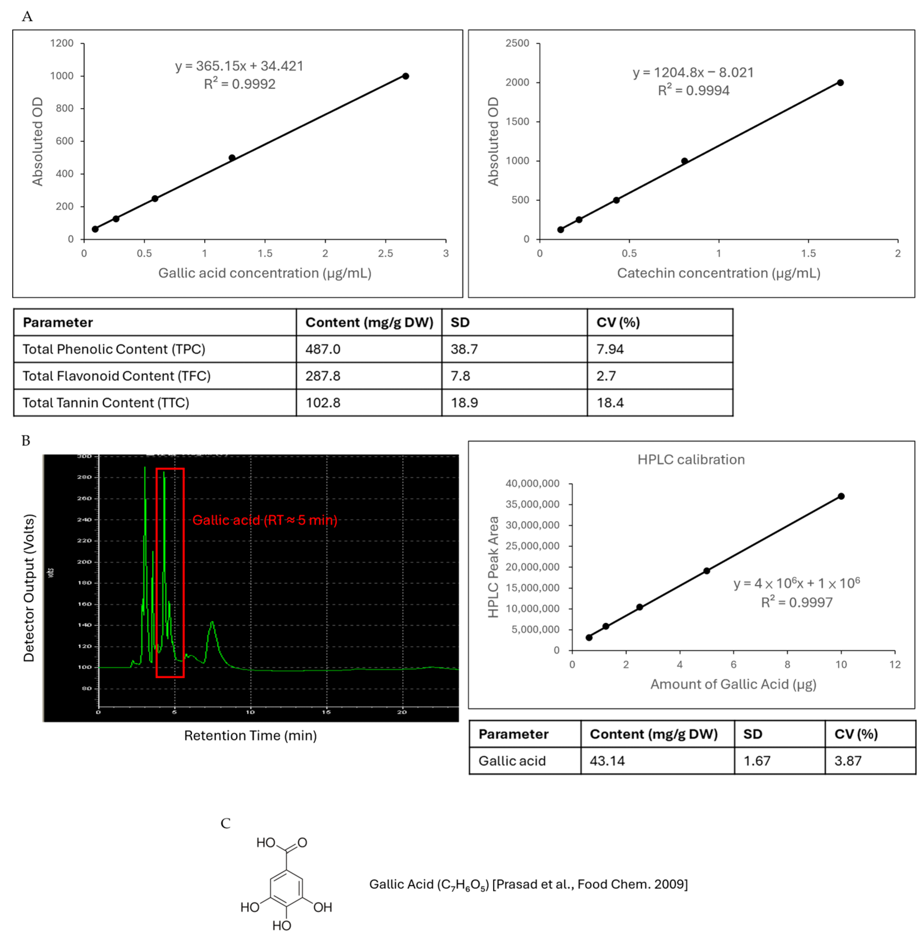 Figure 1. Quantification and profiling of phenolic compounds in Litchi chinensis seed extract (LCSE). (A) Calibration curves for gallic acid and catechin used for determination of total phenolic content (TPC), total flavonoid content (TFC), and total tannin content (TTC). The bar table summarizes the mean ± SD values (mg/g DW) and coefficients of variation (CV%). (B) Representative HPLC chromatogram of LCSE showing a prominent peak at retention time (RT) ≈ 5 min, identified as gallic acid by external standard comparison. The right panel shows the linear calibration curve for gallic acid quantification (R2 = 0.9997) and the corresponding content of gallic acid (mg/g DW). (C) Chemical structure of gallic acid (C7H6O5), adapted from Prasad et al. [18].