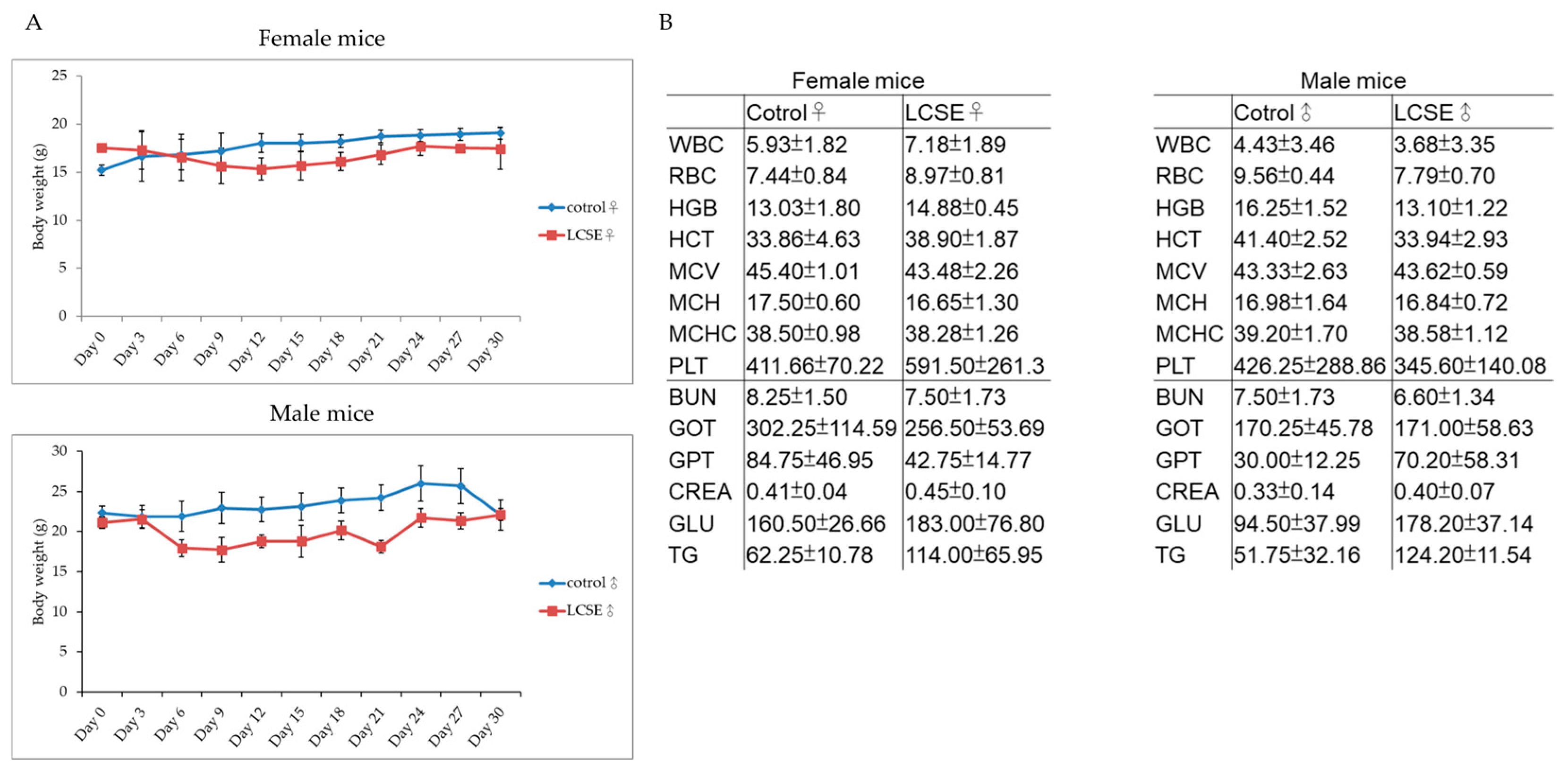 Figure 2. Body weight monitoring and blood analysis in male and female mice after 30-day oral administration of lychee seed extract (LCSE). (A) Body weight was recorded every 3 days. No significant weight loss was observed in either sex. (B) Hematological and biochemical parameters were measured at the end of treatment. All values remained within normal physiological ranges. Data are shown as mean ± SD. No significant differences were observed between LCSE and control groups.