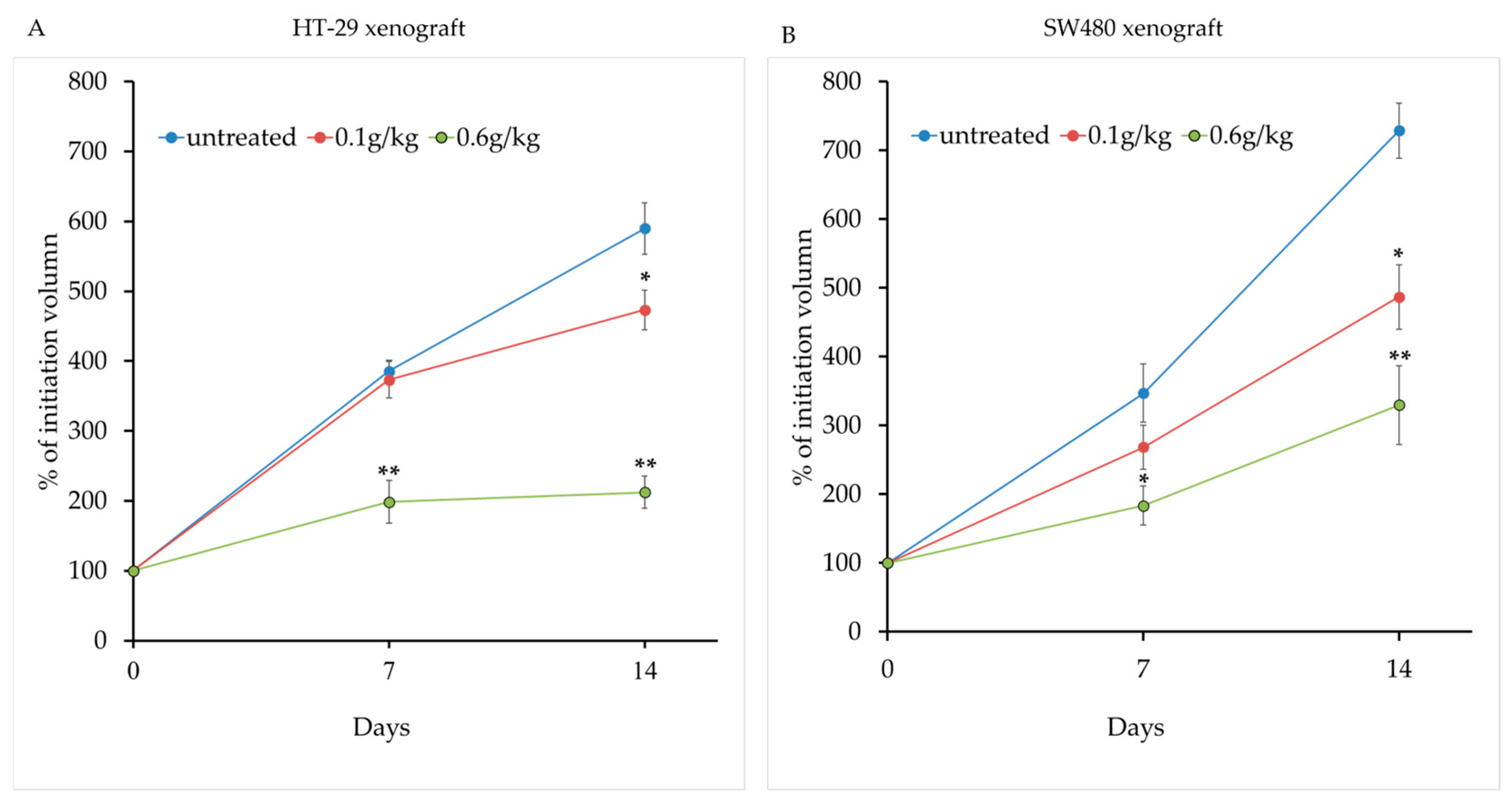 Figure 3. Lychee seed extract suppresses tumor growth in nude mice bearing colorectal cancer xenografts. (A) Tumor growth curves of mice treated with vehicle, 0.1 g/kg, or 0.6 g/kg lychee seed extract for 14 days, starting at ~100 mm3 tumor volume. Measurements were taken on days 7 and 14. (B) Tumor volumes on day 14. The 0.6 g/kg group showed significantly reduced tumor size compared to control. Data are shown as mean ± SEM. * p < 0.05, ** p < 0.01 vs. control.