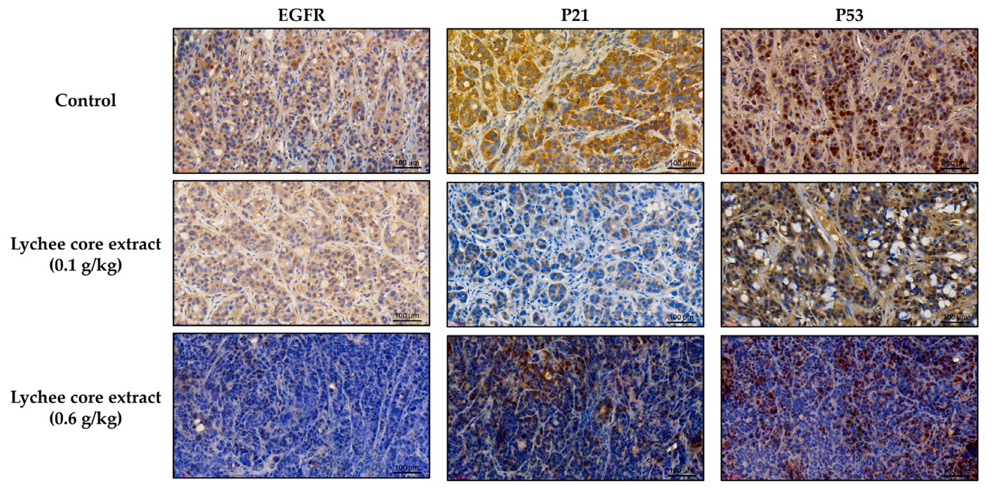 Figure 4. Immunohistochemical staining of EGFR (left), p21 (middle), and p53 (right) in HT-29 xenograft tumors after 14 days of treatment with lychee seed extract. Staining intensity decreased in a dose-dependent manner, with the 0.6 g/kg group showing the greatest reduction (Scale bar ≈ 100 µm).