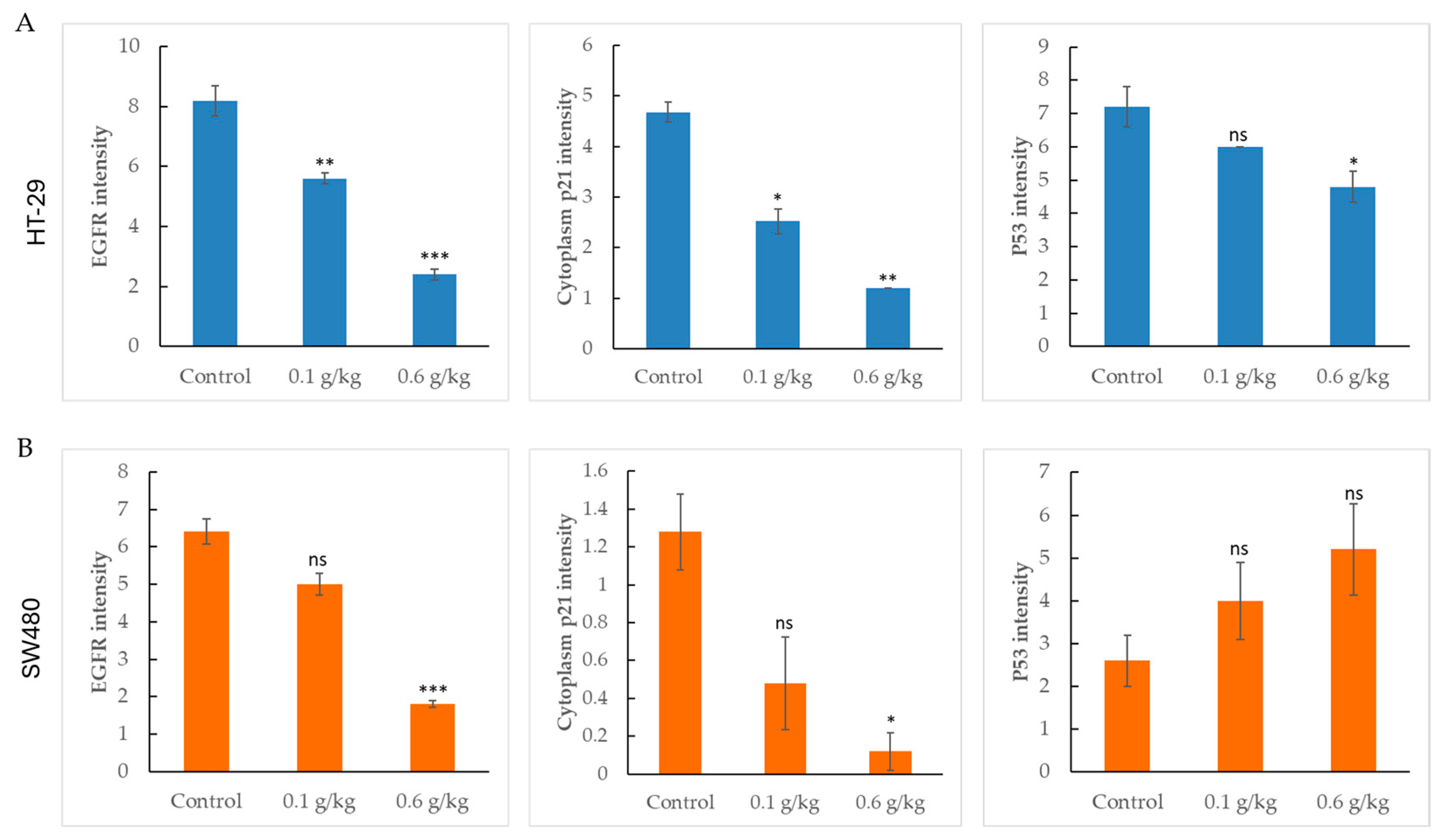 Figure 5. Quantification of EGFR, p21, and p53 expression in HT-29 and SW480 colorectal cancer xenograft tumors after lychee seed extract treatment. (A) In HT-29 xenografts, lychee seed extract significantly reduced expression of all three proteins in a dose-dependent manner. (B) In SW480 xenografts, EGFR and p21 were reduced mainly at the high dose (0.6 g/kg), while p53 expression remained unaffected. Data are shown as mean ± SEM. * p < 0.05, ** p < 0.01, *** p < 0.001 vs. control; ns, not significant.