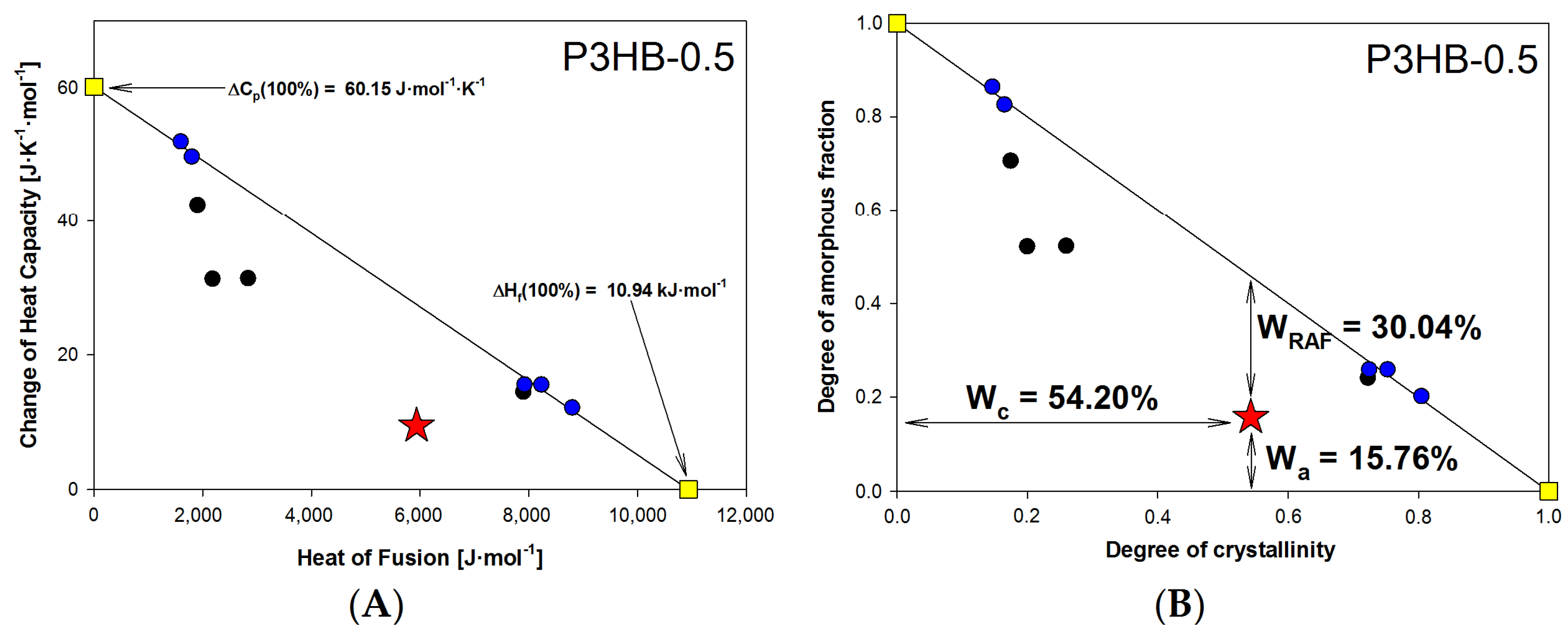 - Czerniecka-Kubicka, A.; Zarzyka, I.; Pyda, M. Advanced analysis of poly(3-hydroxybutyrate) phases based on vibrational heat capacity. J. Therm. Anal. Calorim. 2017, 127, 905–914. [Google Scholar] [CrossRef]