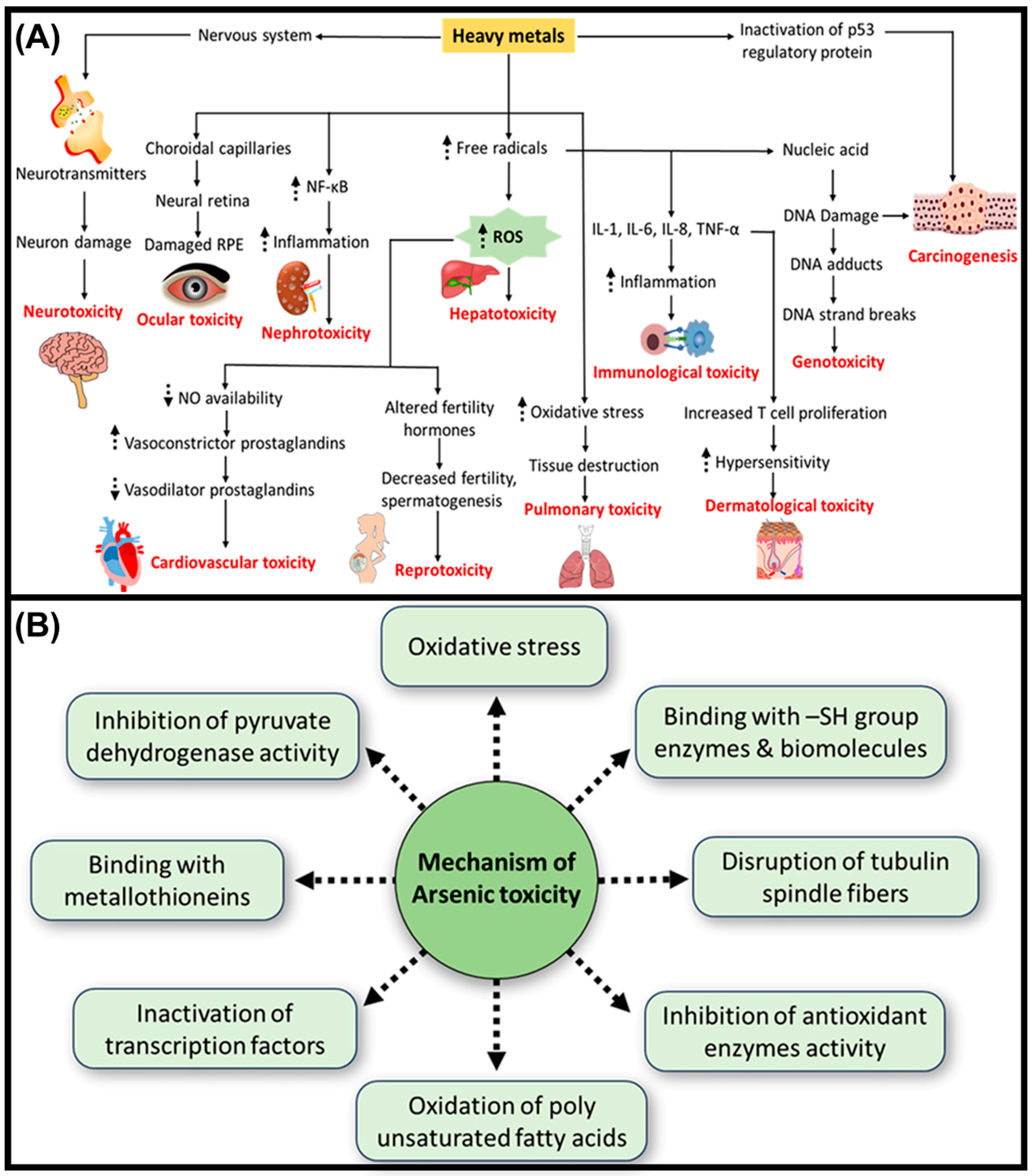 Figure 2. (A) Mechanistic overview of key pathogenic responses to heavy metal toxicity. (B) Schematic illustration depicting different mechanisms for arsenic toxicity in the human body.