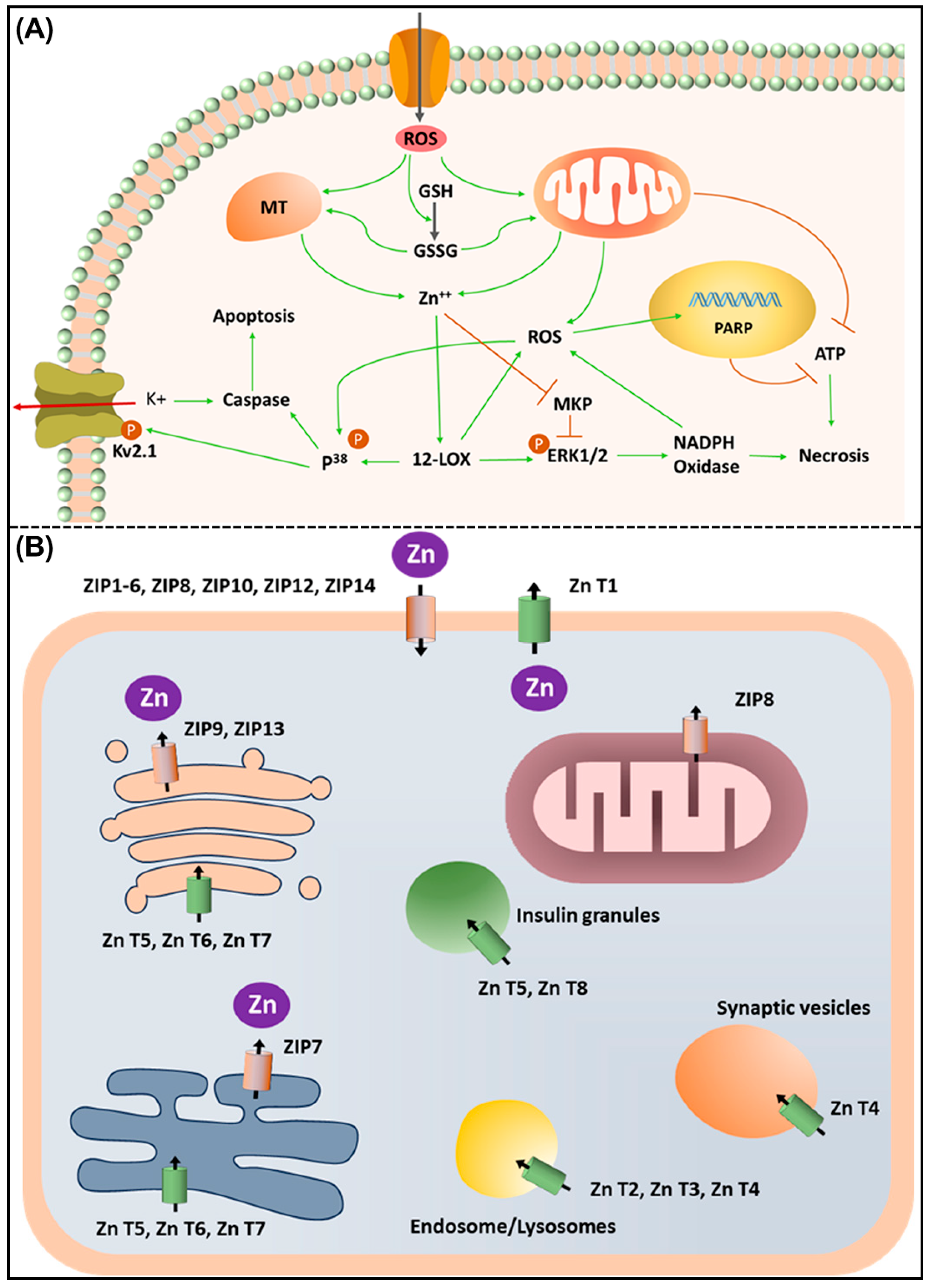 Figure 4. (A) Mechanism of neuronal cell death mediated by zinc: Zinc induces the production of ROS by activating enzymes such as NADPH oxidase and xanthine oxidase. The resulting ROS trigger mitochondrial dysfunction and activate apoptotic pathways, ultimately leading to neuronal cell death. (B) The 14-member ZIP family, which contains eight putative transmembrane domains, increases cytoplasmic Zn levels by facilitating the influx of Zn from either intracellular organelles or the extracellular environment.